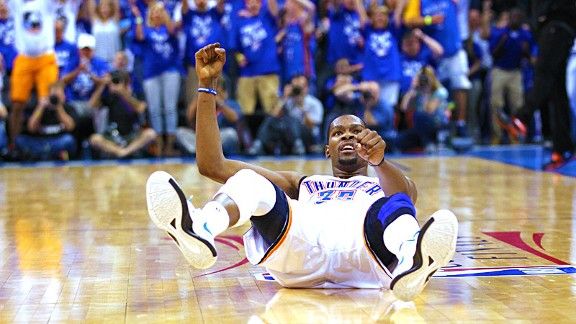 Tras ver la ventaja de 15 puntos de su equipo reducida a cuatro, Durant se encargó de las acciones a la mitad del último período para anotar las 16 unidades del Thunder durante un lapso de sólo cinco minutos y poner a los Spurs en un aprieto.